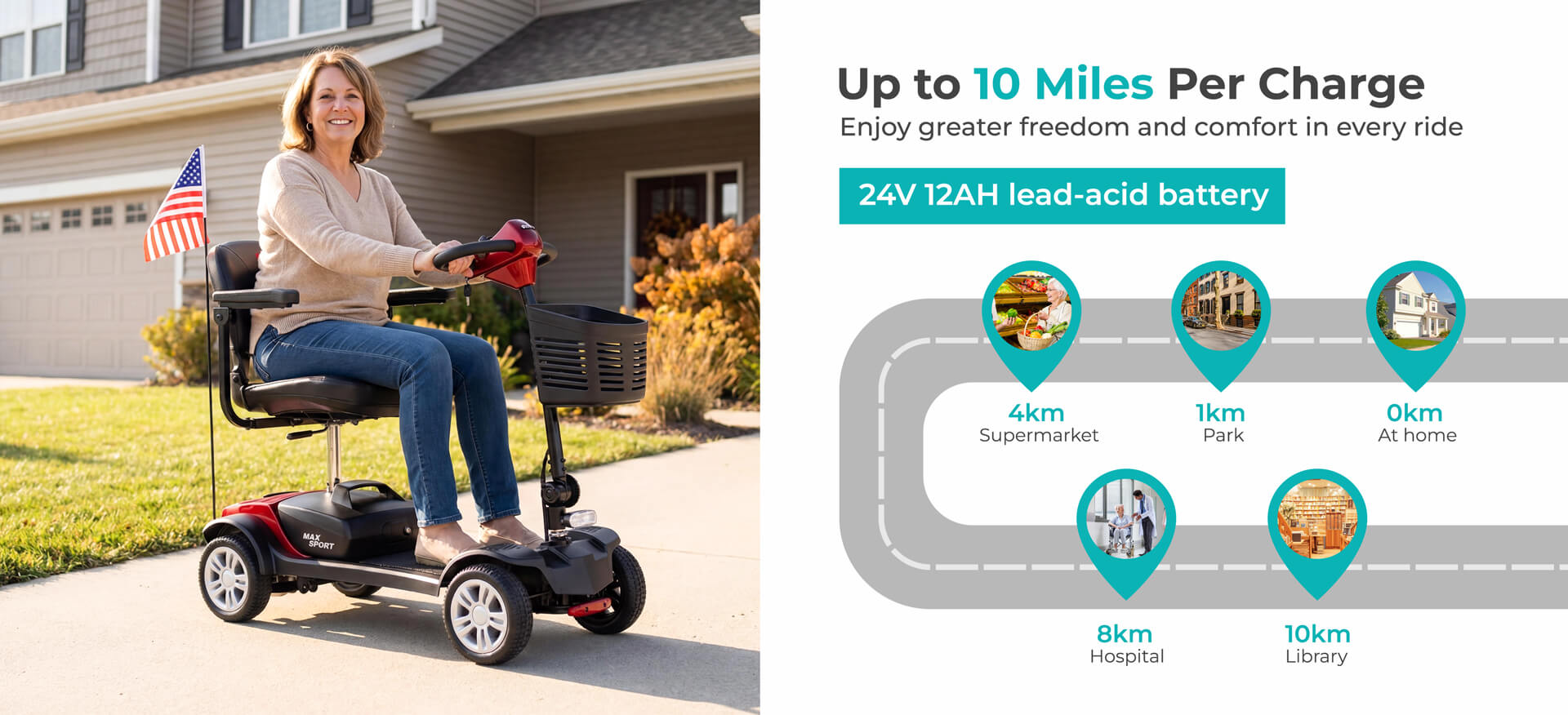 Under typical conditions, Max Sport delivers an estimated 10–16 miles (15–25 km) per charge.