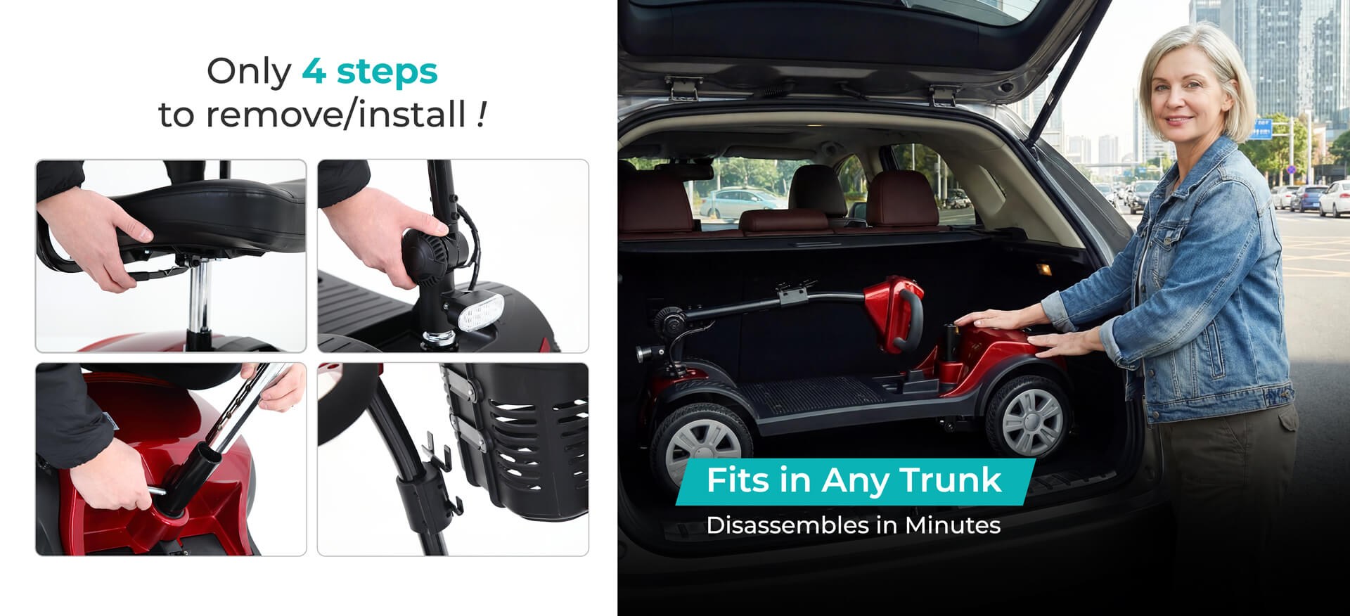 The seat, seat post, battery, basket, and tiller fold or detach within minutes, allowing the scooter to fit into most standard car trunks.