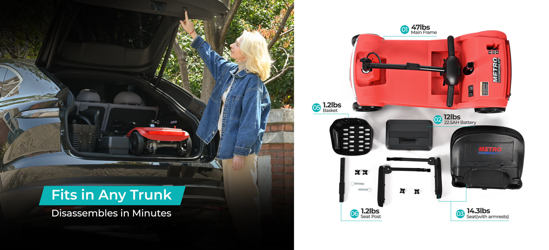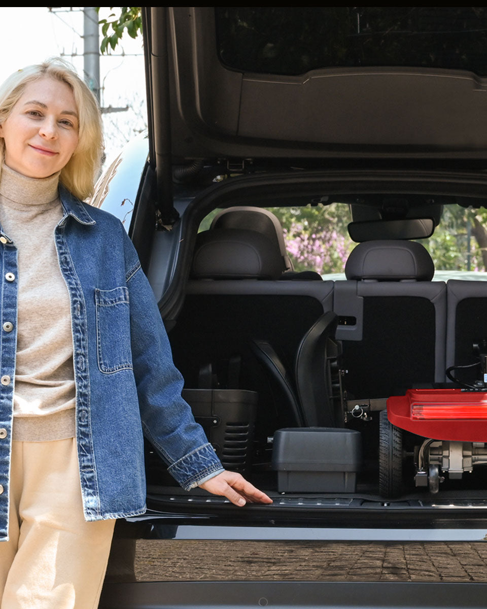 Absolutely. The Metro Mobility M2 is designed with a tool-free modular structure. The seat, seat post, battery pack, basket, and tiller can be removed or folded within minutes, allowing it to fit in most car trunks with ease.