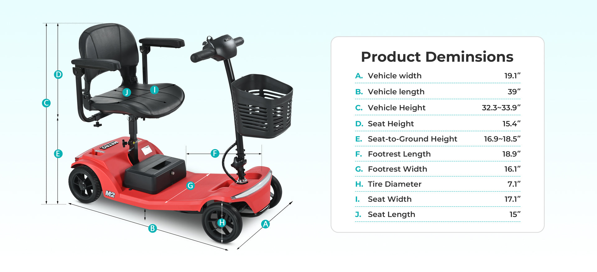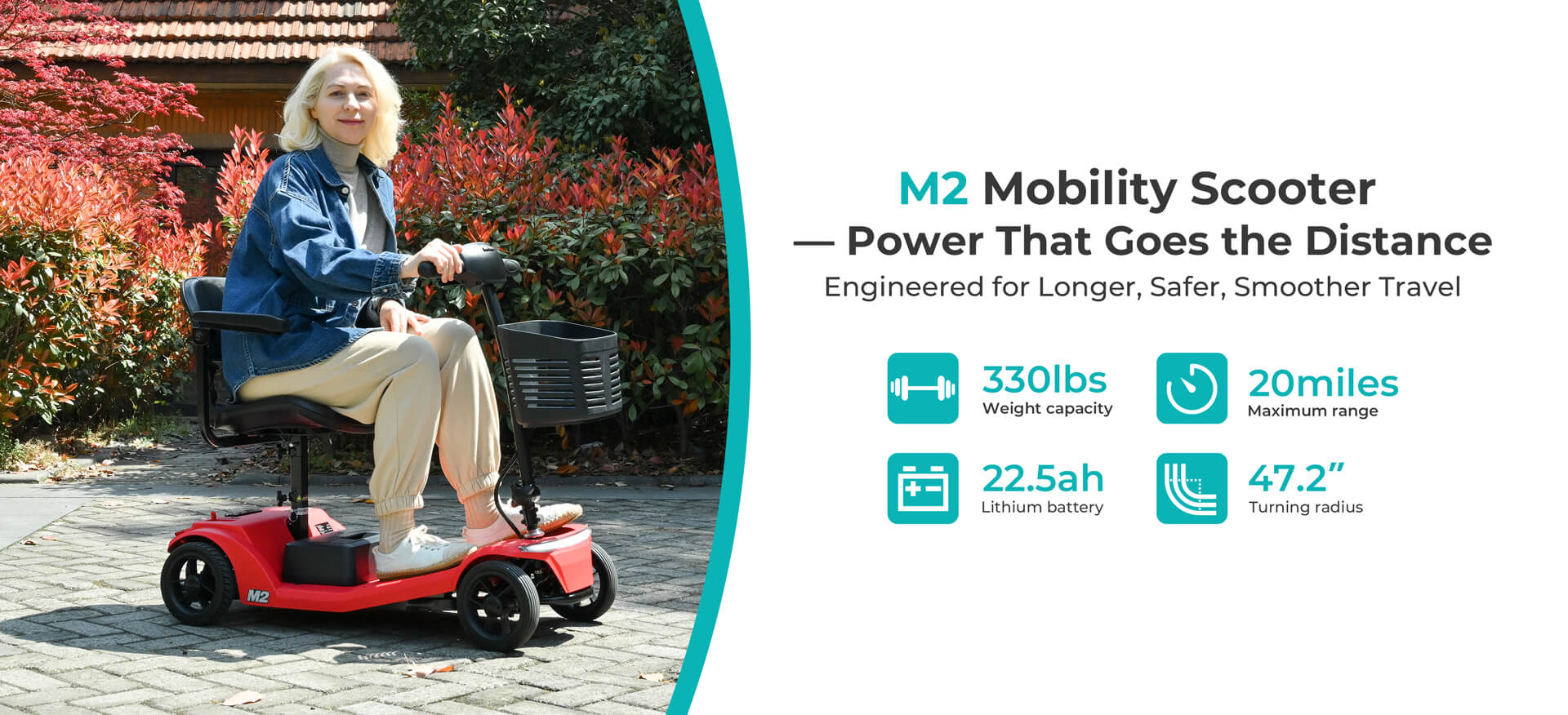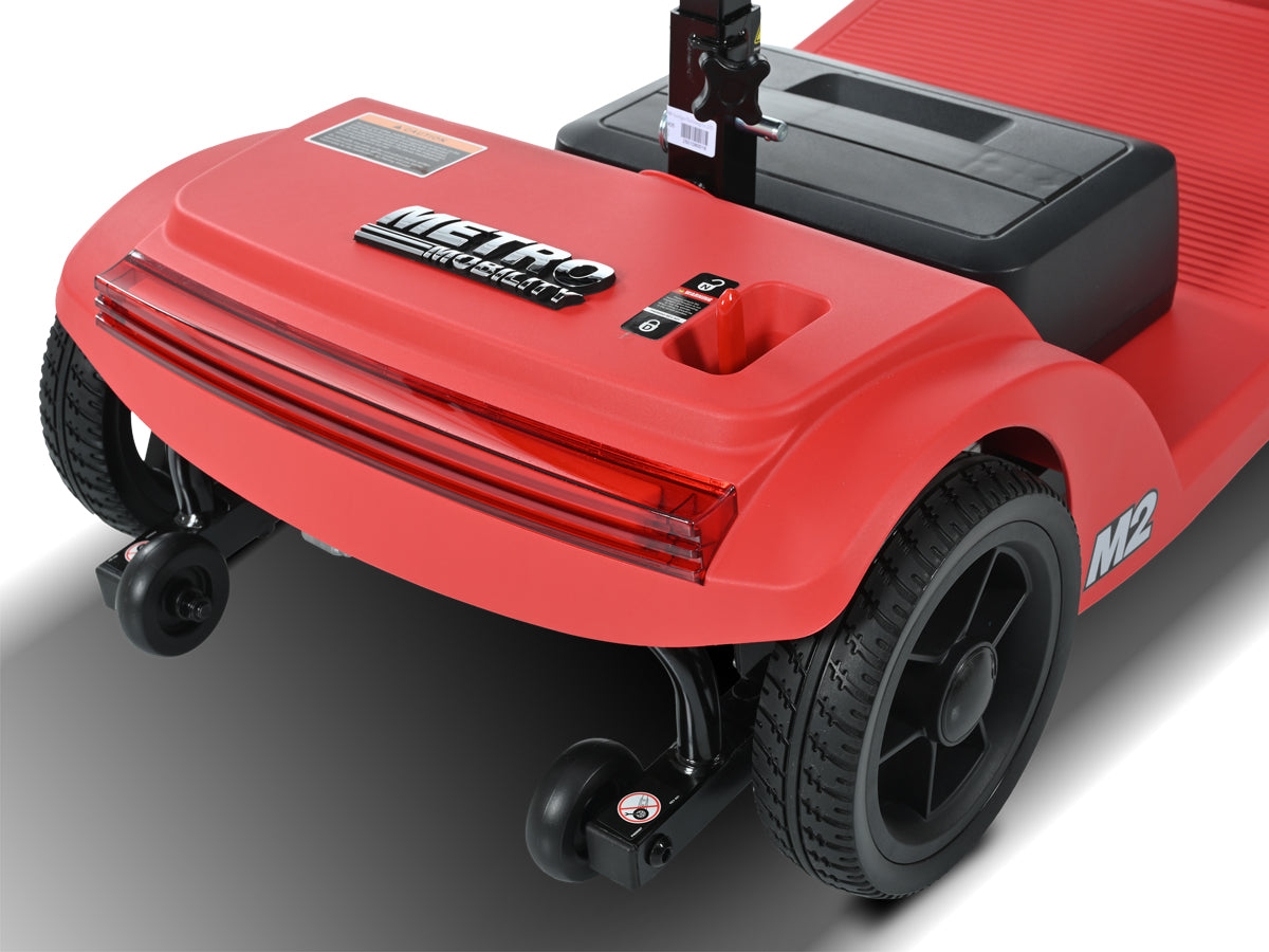 The Metro Mobility M2 is engineered to support riders up to 300 lbs (136 kg). Performance such as hill-climbing and driving range may vary based on rider weight and terrain conditions.